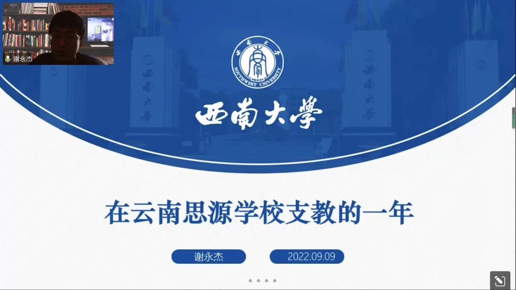 9月9日下午,我院举行2022级优师班开学第一课。西南大学研究生支教团云南昌宁分队队长谢永杰、西南大学研究生支教团西藏昌都分队成员胡晋歌受邀参加,6165cc金沙总站检测中心2022级辅导员唐利平和优师班全体新生线上参与。